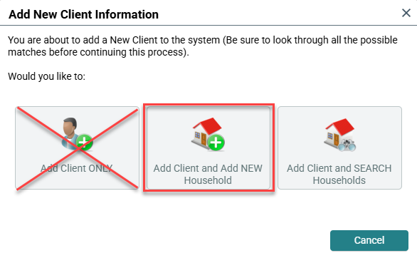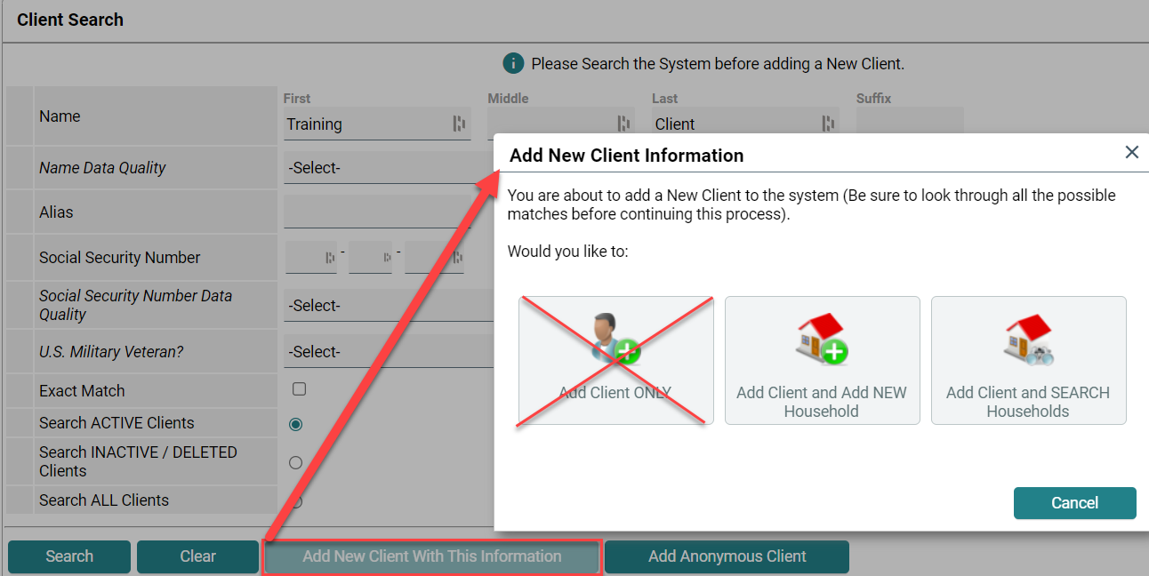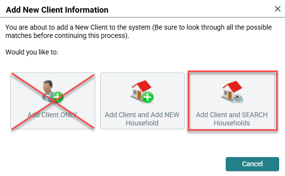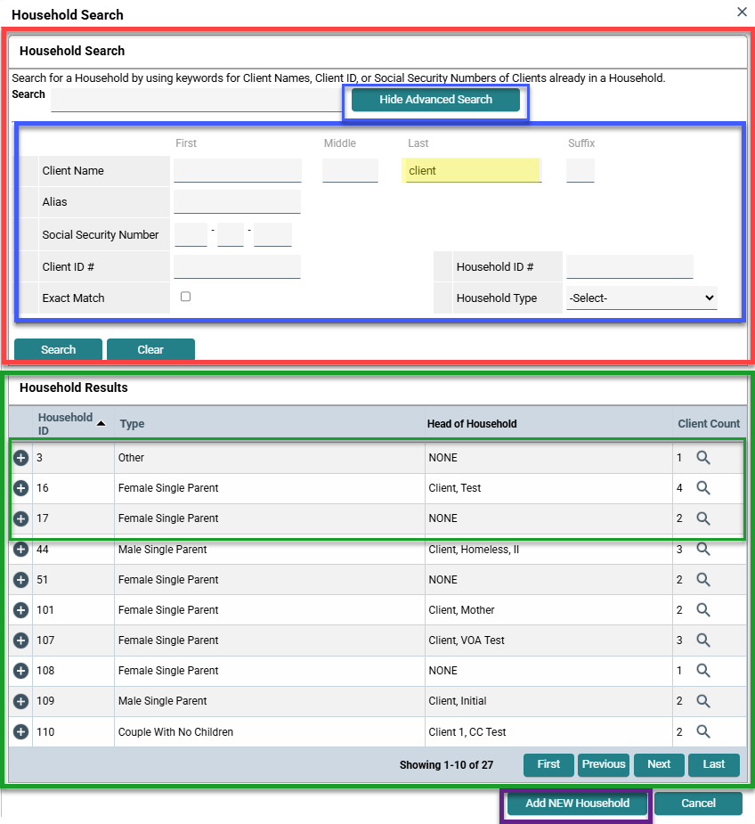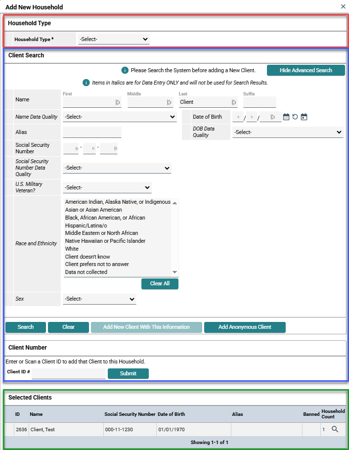 - Client Search: This search field is for you to search and/or create other new household members. If they are a single person household, then disregard this search.
