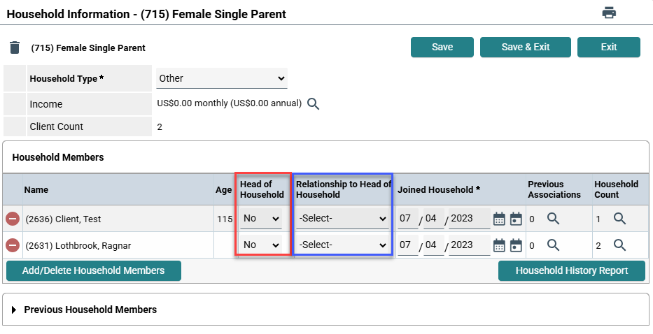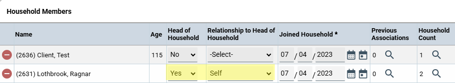When selecting "Yes" for an individual for Head of Household, Relationship to Head of Household will automatically populate "Self"