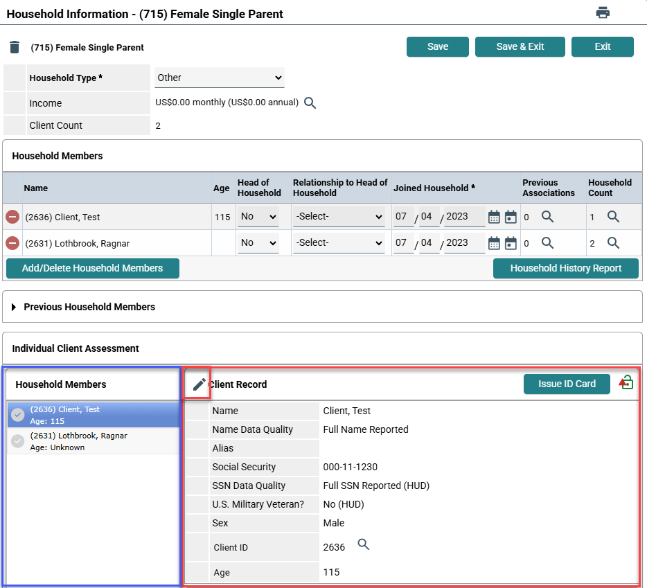 - Clicking each name in the Household Members panel, allows you to go to each client's record.