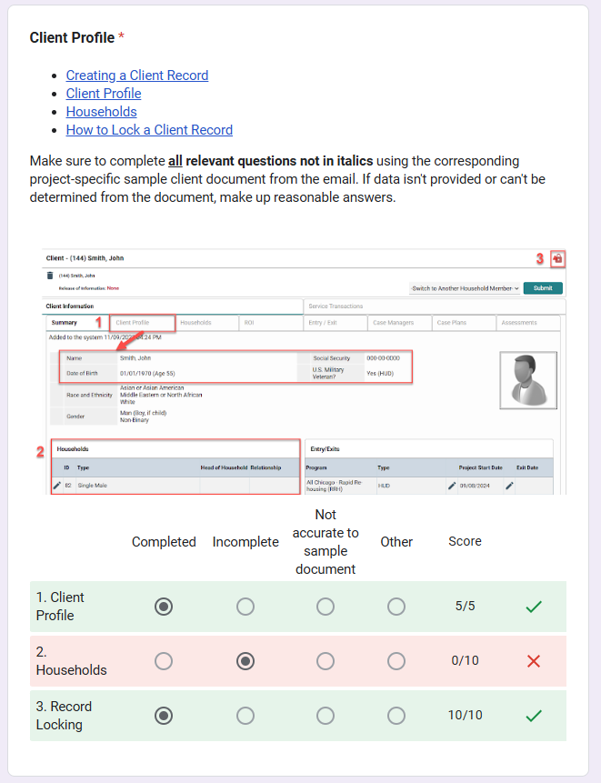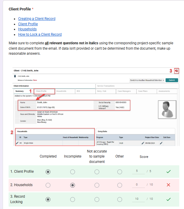 In this session, users will be provided sample client documents, in which they will choose ONE scenario that matches the project-specific course taken and the project they will be entering clients in. Using the information about the sample client, they will be expected to complete a full client record in the training site.