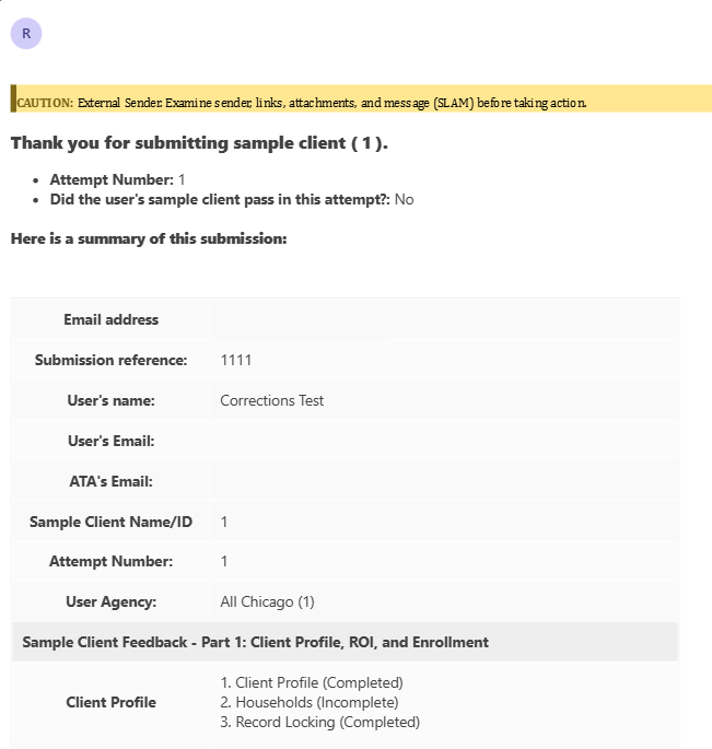 When users complete their sample client record, they must submit their sample client ID within the assignment. It would be best practice to review the sample client with the ATA before submitting to ensure that the data is entered accurately and they are able to pass the assignment in a timely manner.