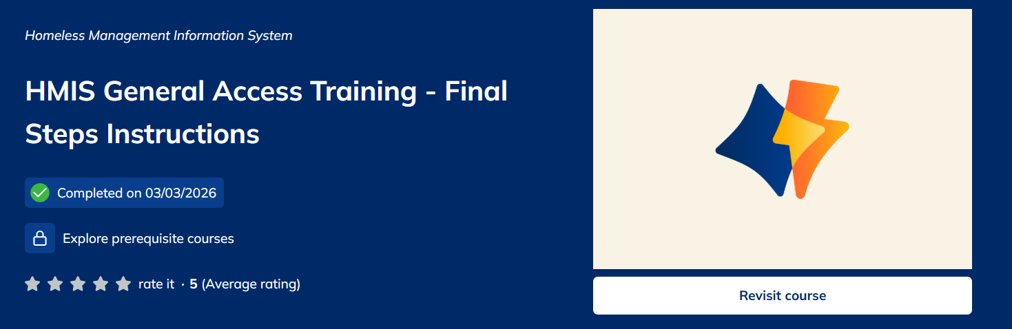 - Users that require Coordinated Entry 1474 access must complete the Housing Resource Specialist training in addition to or instead of, depending on need.